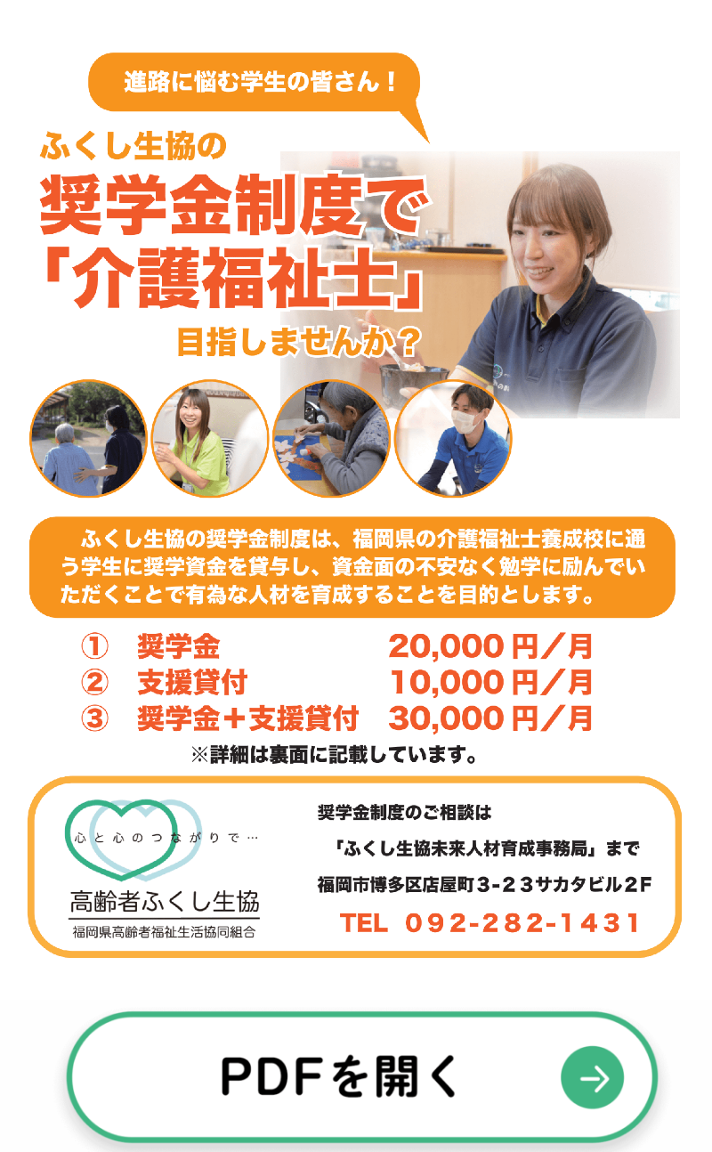News お知らせ 一覧へ戻る NEWS 20225/11Wed. ふくし生協の奨学金制度で『介護福祉士』を目指しませんか! ふくし生協では介護・福祉を志す学生の皆さんへ奨学金支援を実施しております。制度詳細についてはお問い合わせください。